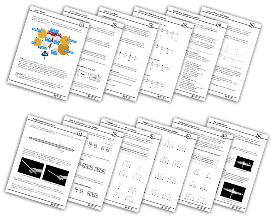 Pad Exercises – No drum kit? No problem! Practice pad exercises ensure that you can begin your progress even without drums! Beef up your hand development, coordination and begin to master common rudiments and popular sticking patterns.